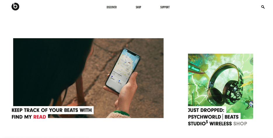 This is currently Beats’ homepage on their website. While not poor by any means, to me the site looked a little boring. I understand the use of white space, as it makes the images pop and gives the site more of a modern feel, but personally, I found this to be visually unappealing, and giving the opposite feel of the loud, trailblazing identity that Beats has built for itself. I’m all for using white space, but Beats’ website consisted almost entirely of images and words randomly dropped on the page. It felt like it had no structure. Not just that but it was incredibly difficult to find anything on the site. For starters, Beats has a staff consisting of some incredibly talented writers who author some amazing pieces about the crossroads between race and music. This is a valuable tool to have, as not many headphones or electronic companies can say that they have staff writers. Unfortunately, their articles were difficult to find on the Beats’ website.