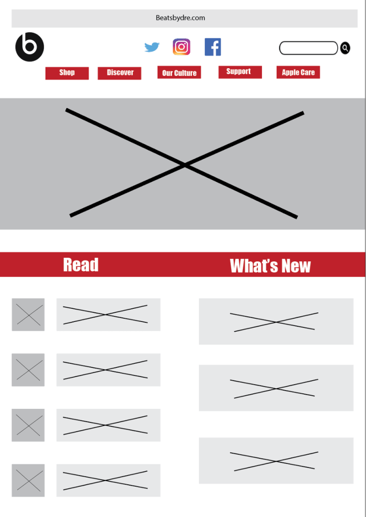 Under the photos I have two columns. The first of the two is where Beats will have their most recent articles posted. While users can already find articles under the “Read” option located under the “Discover Tab”, I really want to showcase some of this work on Beats’ homepage because it is something that is so incredibly unique and valuable to the company. This will give users another reason to access the Beats site rather than just purchasing Beats products. The right column will be where Beats showcases their new items. While again, there is already an option to access Beats’ new items under the “Discover” tab, I want to showcase Beats’ new products and news on their homepage so users always know what is going on.