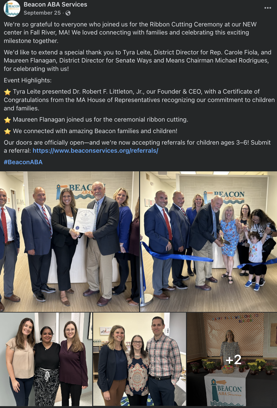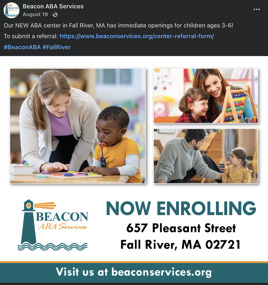 Our client Beacon ABA Services was opening a new ABA center in Fall River, MA, and I created a social media campaign to get the word out and increase client recruitment numbers. We saw a great turnout for their open house event, and this social media campaign helped their client list steadily grow before the grand opening of the new center.