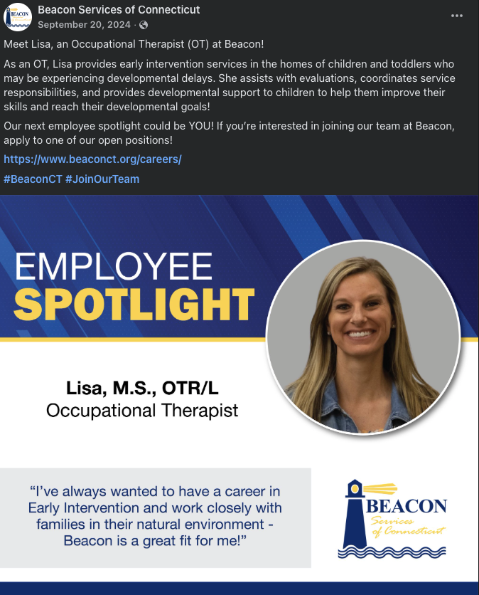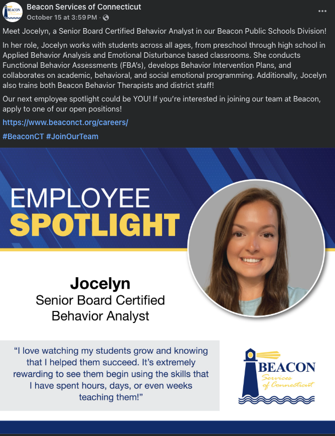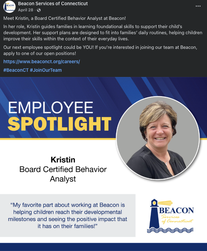 Our client Beacon Services of Connecticut was having difficulty recruiting staff to join their team, so I created this employee spotlight social media campaign. Beacon saw an increase in employee satisfaction after seeing themselves or their coworker being highlighted on social media, and most importantly, their employee hiring and retention numbers have jumped since the campaign began.