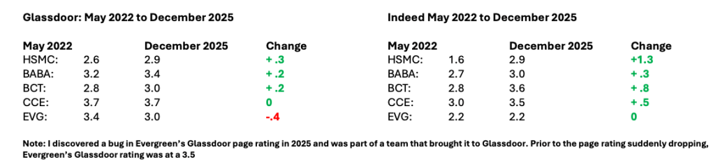 I am also responsible for increasing each brands page rating. I have done direct outreach to solicit new reviews, populated each page with content and digestible information, provided materials and platform support to clients, and met with recruitment teams to create a plan to regularly reach out to new hires to solicit new reviews. Since my start date (May of 2022), here is how each page rating has been affected: