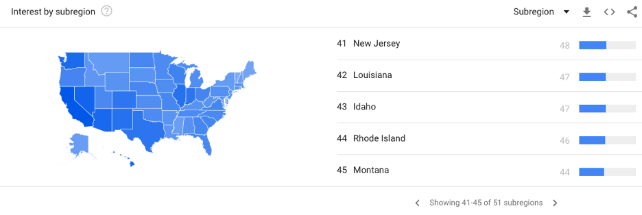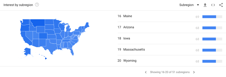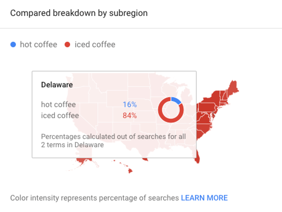 According to google trends, states like Delaware googled “Iced coffee” a staggering number of times in comparison to hot coffee, suggesting that coffee drinkers from Delaware drink considerably more iced coffee than hot coffee. If you’re a coffee shop that specializes in iced coffee, then these numbers are fantastic to you – but it would also mean that for the 16% of coffee drinkers and google users who might prefer their brew hot, they might want to find somewhere else to get their morning joe.