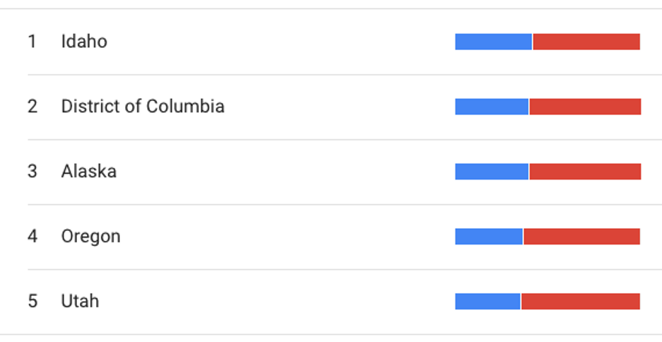 I wanted to see where Idaho ranks nationally in their google searches for the word “Coffee”, and according to this chart, they rank tied for 17th with four other states, putting them in the top 34% of the country. While these numbers don’t jump out at you, it does carry some substantial weight. Idaho ranks higher than the stereotypical heavy coffee drinking states of New Hampshire, Connecticut, New York, and New Jersey, while its 68% of shared google searches is only 5% away from being ranked in the top ten nationally.